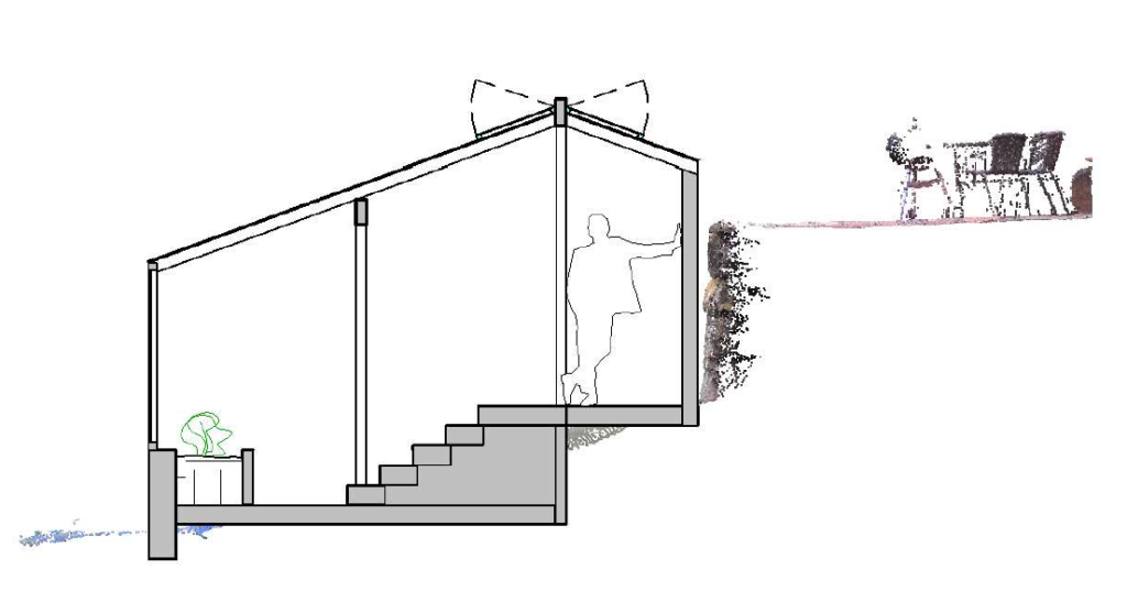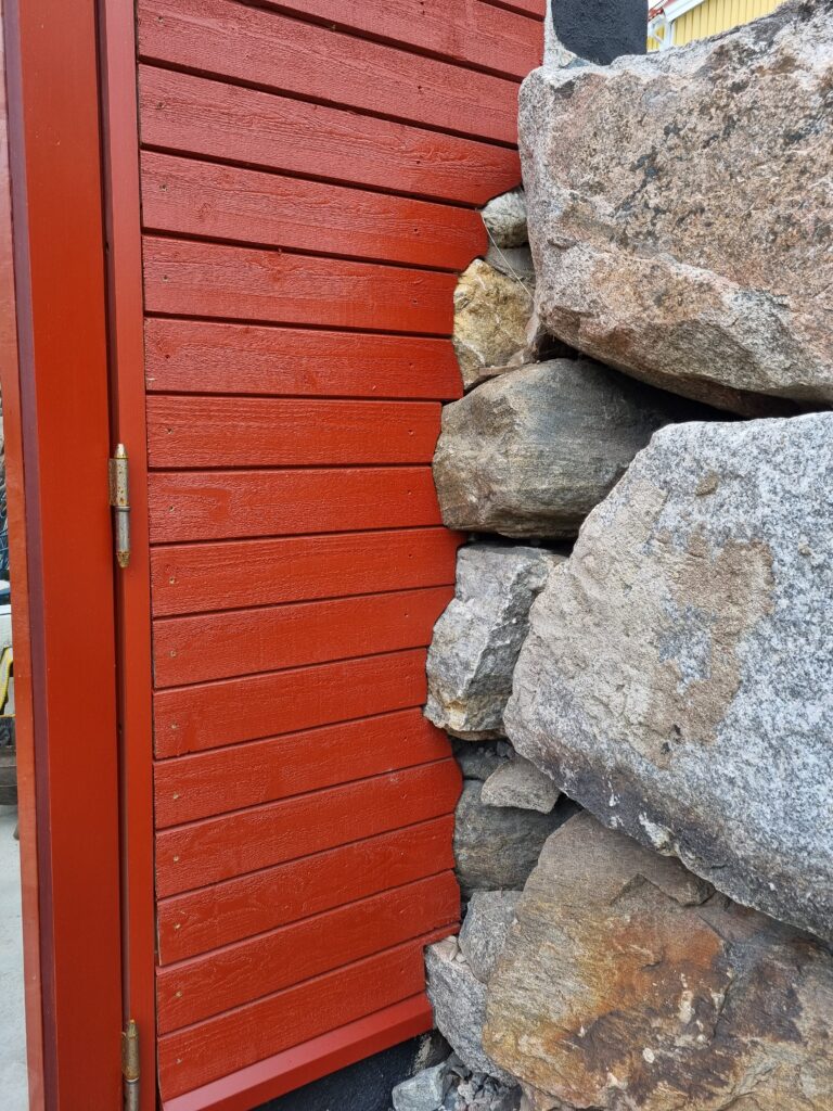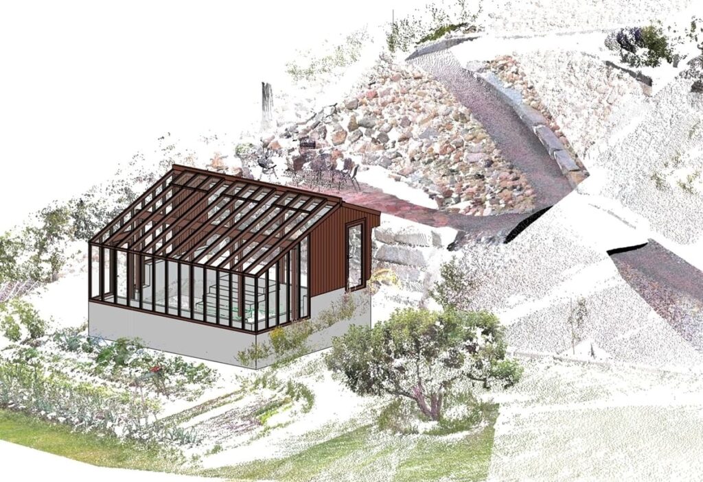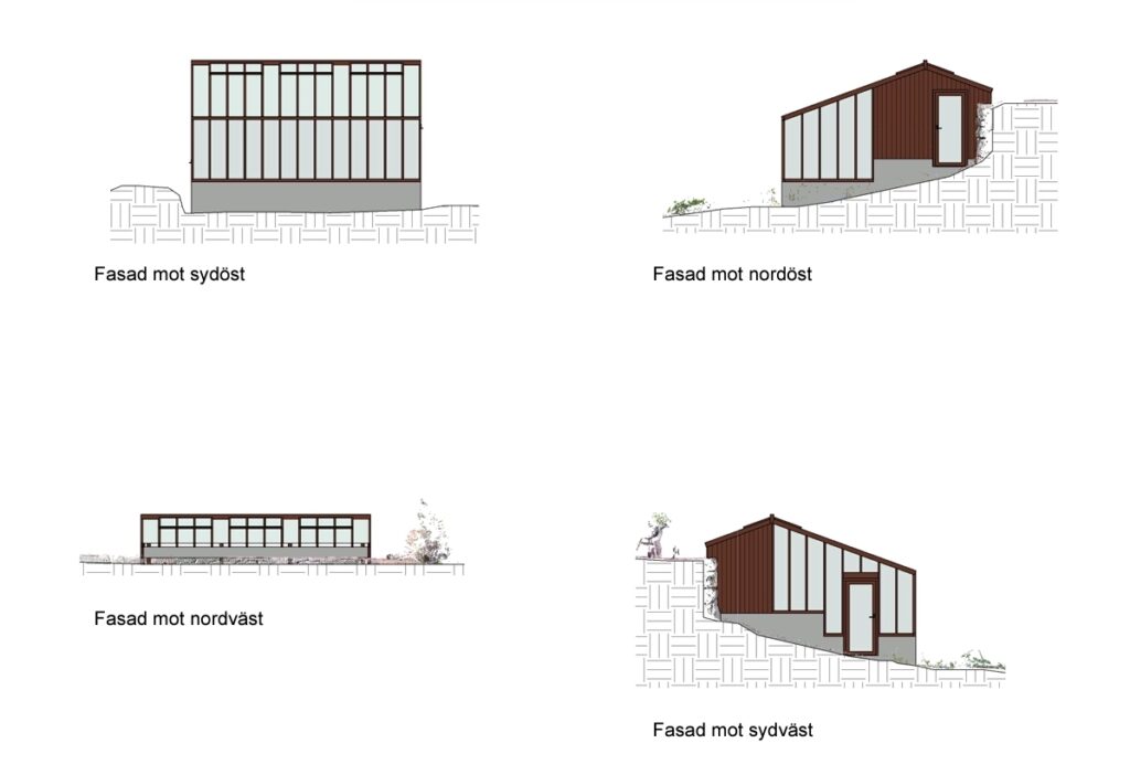 Växthus på 30 m2 i Vika utanför Falun. Växthuset är byggt i två etage med murad sockel och ramverk i trä. I bakkant finns en värmebuffrande stenmur.
