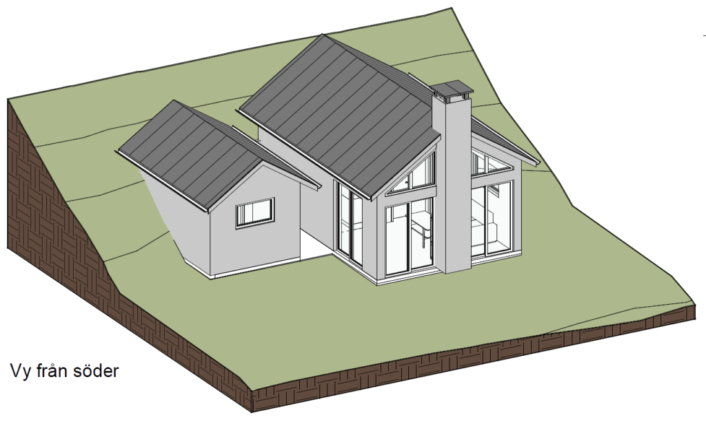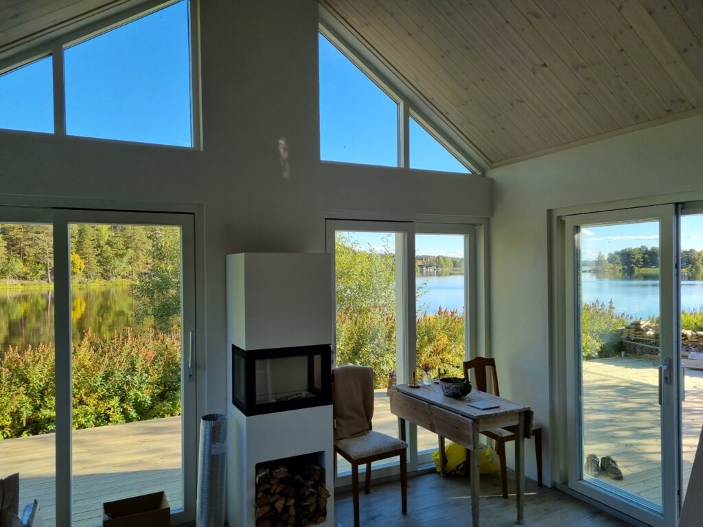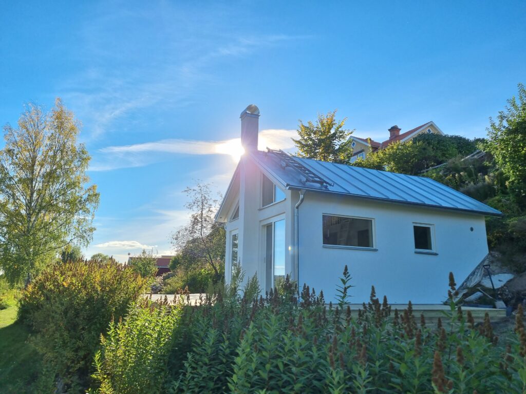 Gäststuga och bastu i Vika utanför Falun. Murade och putsade ytterväggar med takstolar i trä och invändiga snickerier. 100 m2 tralldäck i olika nivåer.